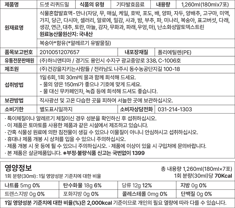 일반식사를 발효액상식사인 드셋 리퀴드밀로 대체 - 드셋 애프터밀 mini: 2box(1box=7포)