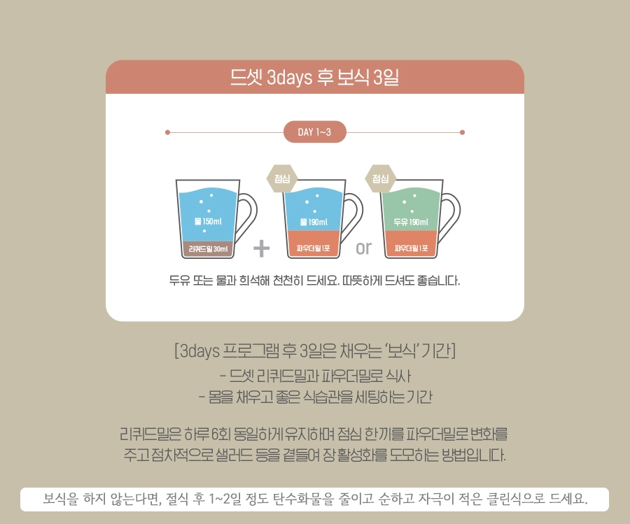 3일 동안 일반식사를 드셋 리퀴드밀로